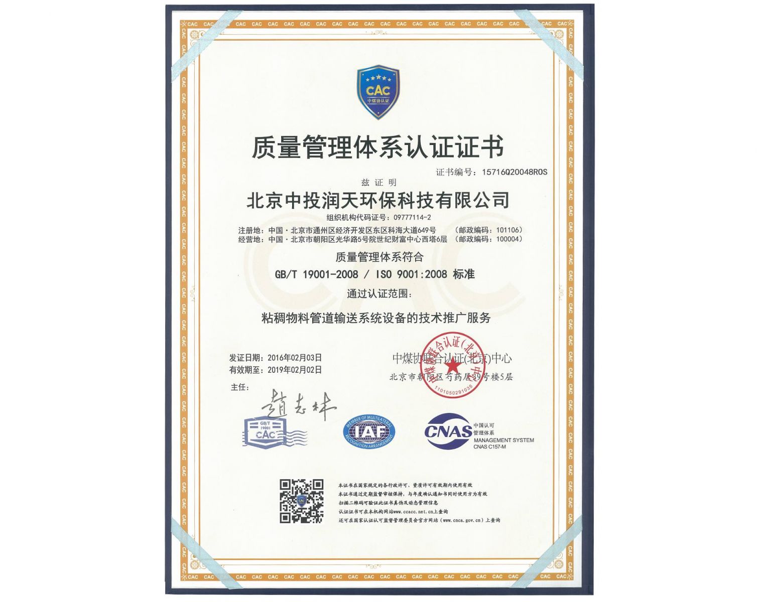 潤天環(huán)保新聞組日前,北京中投潤天環(huán)??萍加邢薰?/span>正式取得了北京中煤協(xié)質(zhì)量認證公司頒發(fā)的GB/T 19001-2008/ISO 9001:2008質(zhì)量管理體系認證證書,標志著公司的質(zhì)量管理體系達到了標準要求,具備提供滿足顧客和適用法律法規(guī)要求的粘稠物料管道輸送系統(tǒng)的生產(chǎn)及服務能力。