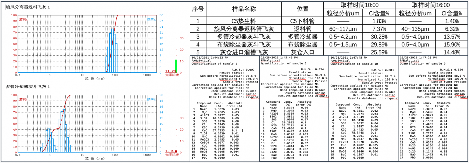 自動(dòng)采樣單元1次/小時(shí)對水泥窯尾熱生料進(jìn)行自動(dòng)采集,并自動(dòng)將樣品送入檢測儀器,對S、Cl、 K有害元素含量進(jìn)行檢測。分析系統(tǒng)將根據(jù)有害元素含量變化自動(dòng)控制除氯系統(tǒng)開關(guān),在窯尾氯含量下降到安全區(qū)后,高效除氯系統(tǒng)自動(dòng)關(guān)閉,避免無效除氯,保證除氯灰高濃度,更智能更節(jié)能。
